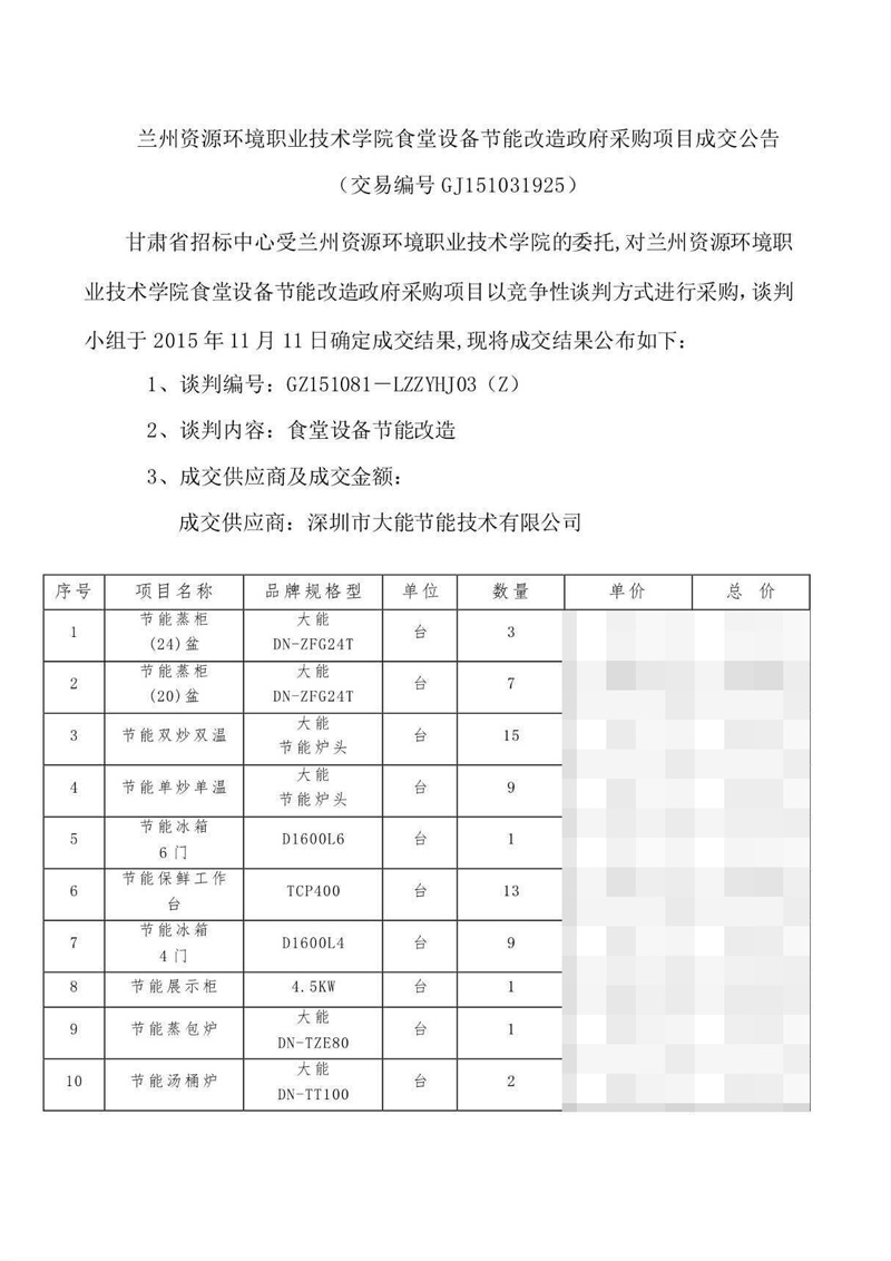 熱烈祝賀深圳市大能節(jié)能技術(shù)有限公司再次中標(biāo)蘭州資源環(huán)境技術(shù)學(xué)院食堂設(shè)備節(jié)能改造政府采購(gòu)項(xiàng)目!